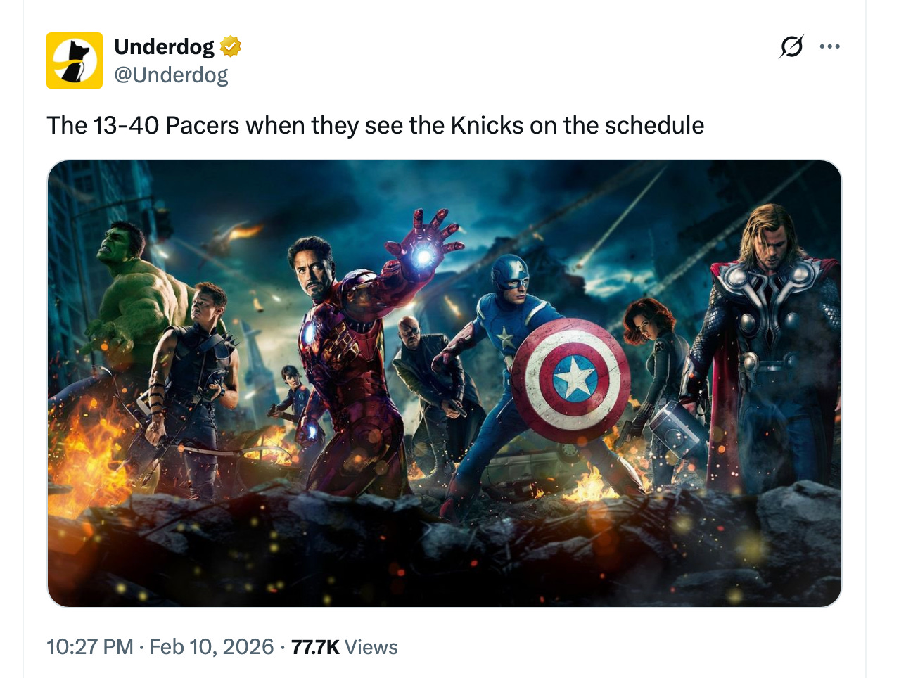 Last night, the @Underdog Twitter account posted a photo of The Avengers underneath the caption “The 13-40 Pacers when they see the Knicks on the schedule.”